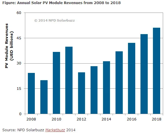 After a recent slump, solar power has shown tremendous growth. Global photovoltaic (PV) capacity is 139 Gigawatts (GW) as of the end of 2013 and another 44.5 GW is forecast to be added in 2014. One GW is enough electricity to power between 750,000 and 1,000,000 US homes. The 44.5 GW mentioned above is almost a 21% increase y-o-y and equals the output of 10 nuclear reactors, according to Bloomberg. The chart below from the EPIA, shows the dramatic rise in PV capacity.