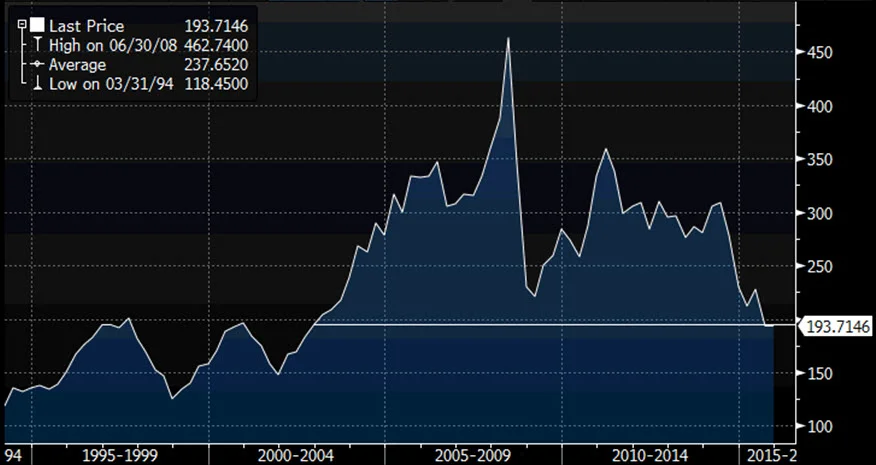 A look at the Reuters CRB index shows what I call a “round tripper”. The index value today is roughly where it was in December of 2002 when the commodity super cycle was just getting underway.
