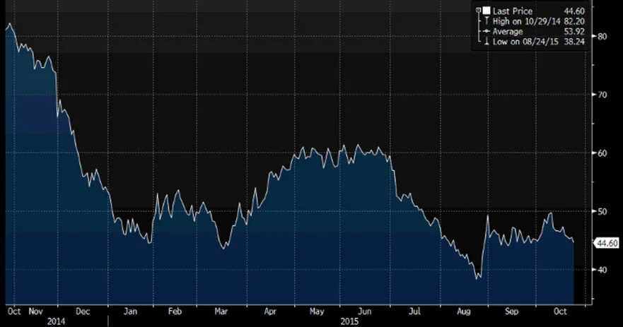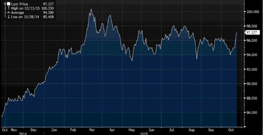 Another point to consider over the past year has been the performance of the US Dollar – up around 12% year-to-date, though it has seemingly plateaued. We think this strength is more due to weakness in other developed economies and emerging markets and the general directionless trend speaks to the muddled message coming from the Federal Reserve about the timing of a short term interest rate increase.