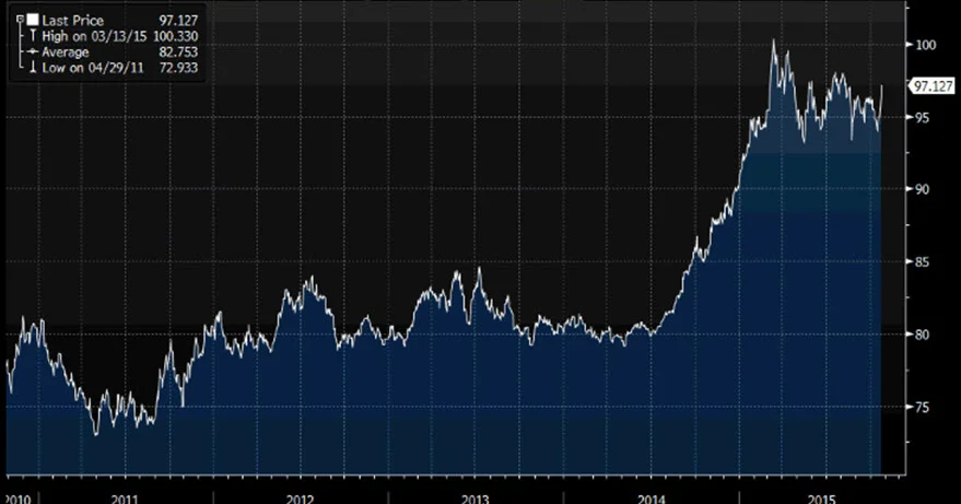 Looking at the USD performance over the past five years says volumes about where the “flight to safety” is today and also offers a good reminder of a headwind for commodities.