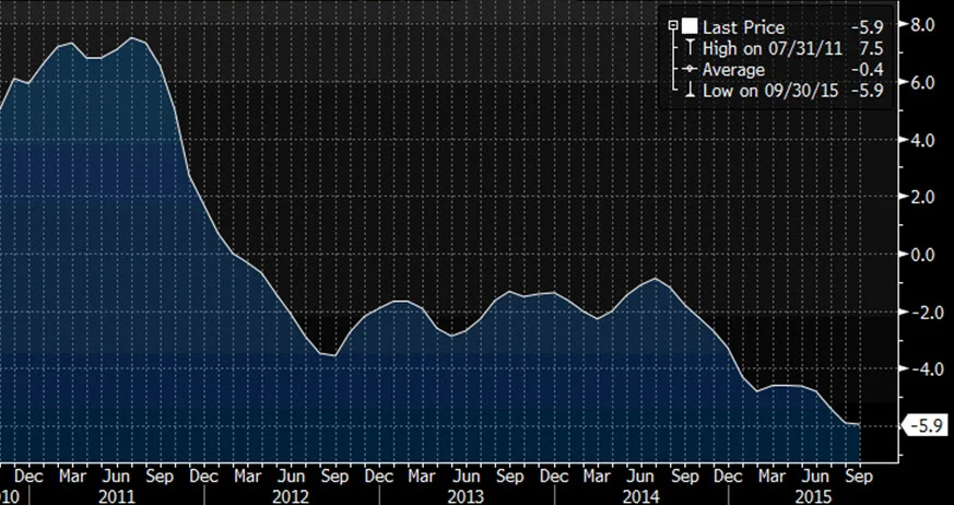 The idea was that as paper asset values increased (in this case stocks), the typical Chinese shareholder would be more inclined to spend. As consumption as a percentage of GDP increased, this would allow for the beginnings of a shift away from export and investment-led growth. The collapse of the equity bubble in China has sent policy makers effectively “back to the drawing board”. Making matters more confusing, this shift is happening against a backdrop of Chinese manufacturers continuing to export deflation as we see here with the Chinese Producer Price Index (PPI) below zero for over 40 months.