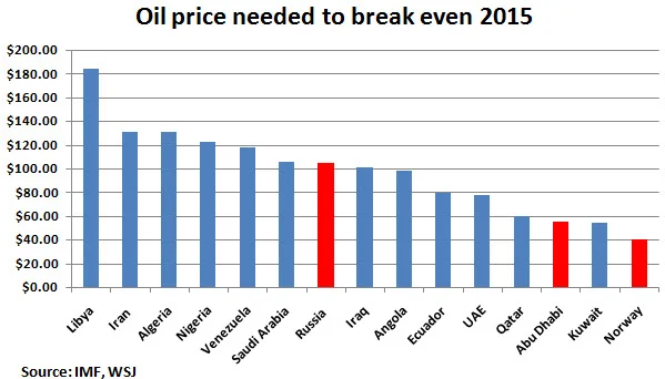 The data here show what oil price OPEC members (in blue) and non-OPEC (in red) need to stay out of a fiscal deficit. This is NOT the price needed to make money on a barrel of oil. Many believe that the new normal oil price will be $65 for the next couple years. If this is true (and we think it’s likely), the potential for social instability and geopolitical fireworks will only increase.